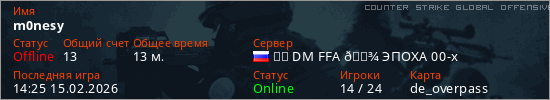 Играет на Counter Strike Global Offensive сервере. Страна: РоссияПервый раз замечен 20:38 12.02.2026