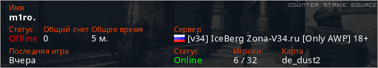 Играет на Counter Strike Source сервере. Страна: РоссияПервый раз замечен 19:43 25.03.2026