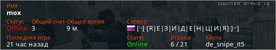 Играет на Counter Strike 1.6 сервере. Страна: РоссияПервый раз замечен 22:44 11.03.2026