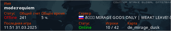 Играет на Counter Strike Global Offensive сервере. Страна: РоссияПервый раз замечен 18:45 25.03.2025