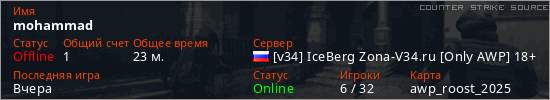 Играет на Counter Strike Source сервере. Страна: РоссияПервый раз замечен 18:08 13.03.2026