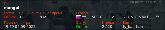 Играет на Counter Strike 1.6 сервере. Страна: РоссияПервый раз замечен 22:18 07.03.2025