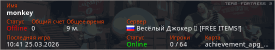 Играет на Team Fortress 2 сервере. Страна: РоссияПервый раз замечен 10:33 25.03.2026