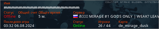 Играет на Counter Strike Global Offensive сервере. Страна: РоссияПервый раз замечен 03:17 06.08.2024