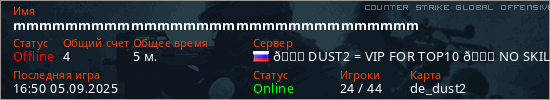 Играет на Counter Strike Global Offensive сервере. Страна: РоссияПервый раз замечен 16:38 05.09.2025