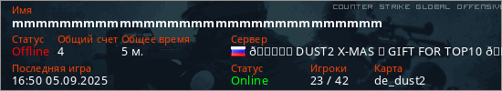 Играет на Counter Strike Global Offensive сервере. Страна: РоссияПервый раз замечен 16:38 05.09.2025