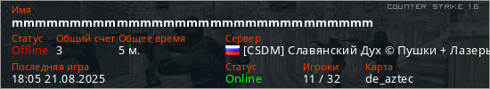 Последний раз был в сети 18:05 21.08.2025 Игрок с таким ником замечен на 15 серверах