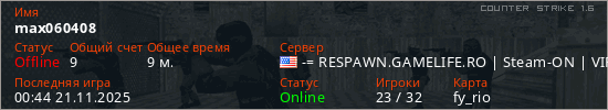 Играет на Counter Strike 1.6 сервере. Страна: СШАПервый раз замечен 00:34 21.11.2025