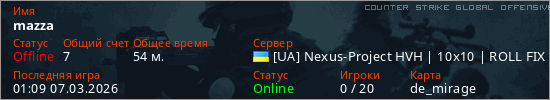 Играет на Counter Strike Global Offensive сервере. Страна: УкраинаПервый раз замечен 22:00 16.02.2026