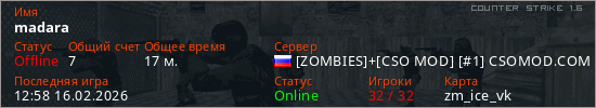 Играет на Counter Strike 1.6 сервере. Страна: РоссияПервый раз замечен 17:46 12.02.2026