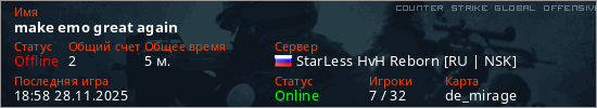 Играет на Counter Strike Global Offensive сервере. Страна: РоссияПервый раз замечен 18:50 28.11.2025