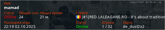 Играет на Counter Strike 1.6 сервере. Страна: РумынияПервый раз замечен 18:16 27.06.2024