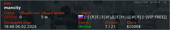Играет на Counter Strike 1.6 сервере. Страна: РоссияПервый раз замечен 18:46 06.02.2026