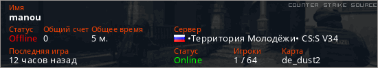 Играет на Counter Strike Source сервере. Страна: РоссияПервый раз замечен 11:36 05.12.2025
