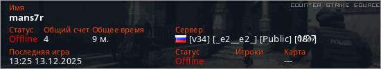 Играет на Counter Strike Source сервере. Страна: РоссияПервый раз замечен 20:11 10.12.2025