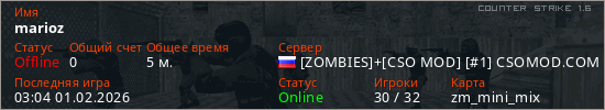 Играет на Counter Strike 1.6 сервере. Страна: РоссияПервый раз замечен 03:02 01.02.2026