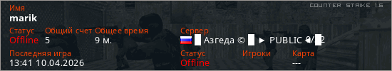 Играет на Counter Strike 1.6 сервере. Страна: РоссияПервый раз замечен 14:45 09.04.2026