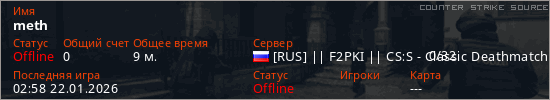 Играет на Counter Strike Source сервере. Страна: РоссияПервый раз замечен 01:47 22.01.2026