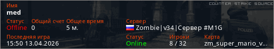 Играет на Counter Strike Source сервере. Страна: РоссияПервый раз замечен 15:48 13.04.2026