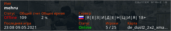 Играет на Counter Strike 1.6 сервере. Страна: РоссияПервый раз замечен 15:41 13.05.2020