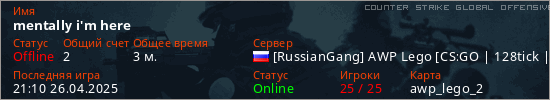 Играет на Counter Strike Global Offensive сервере. Страна: РоссияПервый раз замечен 21:10 26.04.2025