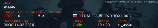 Играет на Counter Strike Global Offensive сервере. Страна: РоссияПервый раз замечен 06:17 14.02.2026