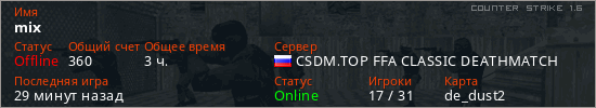 Играет на Counter Strike 1.6 сервере. Страна: РоссияПервый раз замечен 17:04 29.11.2021