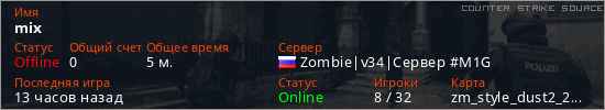 Играет на Counter Strike Source сервере. Страна: РоссияПервый раз замечен 19:06 15.03.2026