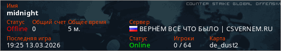 Играет на Counter Strike Global Offensive сервере. Страна: РоссияПервый раз замечен 19:19 13.03.2026