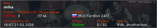 Играет на Team Fortress 2 сервере. Страна: РоссияПервый раз замечен 13:36 21.03.2026