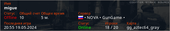 Играет на Counter Strike Source сервере. Страна: РоссияПервый раз замечен 19:22 19.05.2024