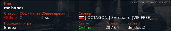 Играет на Counter Strike Source сервере. Страна: РоссияПервый раз замечен 14:07 16.03.2026