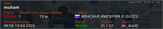 Играет на Counter Strike 1.6 сервере. Страна: РоссияПервый раз замечен 09:25 09.04.2026