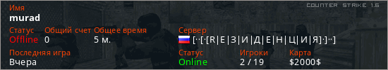 Играет на Counter Strike 1.6 сервере. Страна: РоссияПервый раз замечен 17:42 23.03.2026
