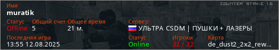 Играет на Counter Strike 1.6 сервере. Страна: РоссияПервый раз замечен 10:15 09.08.2025