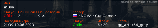 Играет на Counter Strike Source сервере. Страна: РоссияПервый раз замечен 11:04 09.05.2023