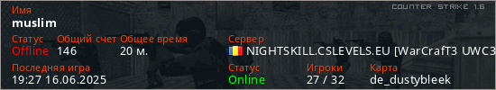 Последний раз был в сети 19:27 16.06.2025 Игрок с таким ником замечен на 28 серверах