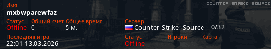 Играет на Counter Strike Source сервере. Страна: РоссияПервый раз замечен 21:59 13.03.2026