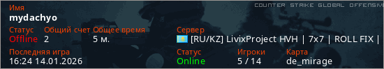 Играет на Counter Strike Global Offensive сервере. Страна: КазахстанПервый раз замечен 16:20 14.01.2026