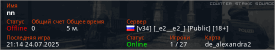 Играет на Counter Strike Source сервере. Страна: РоссияПервый раз замечен 21:06 24.07.2025