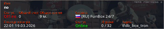 Играет на Team Fortress 2 сервере. Страна: РоссияПервый раз замечен 20:47 19.03.2026