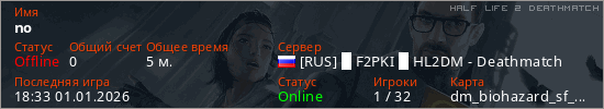 Играет на Half Life 2 DeathMatch сервере. Страна: РоссияПервый раз замечен 18:19 01.01.2026