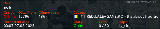 Играет на Counter Strike 1.6 сервере. Страна: РумынияПервый раз замечен 20:26 23.11.2022