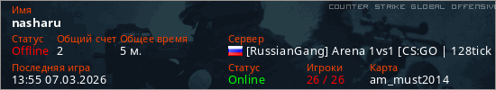 Играет на Counter Strike Global Offensive сервере. Страна: РоссияПервый раз замечен 13:47 07.03.2026