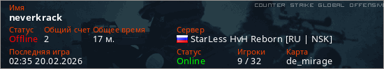 Играет на Counter Strike Global Offensive сервере. Страна: РоссияПервый раз замечен 00:54 04.02.2026