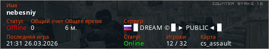 Играет на Counter Strike 1.6 сервере. Страна: РоссияПервый раз замечен 21:28 26.03.2026