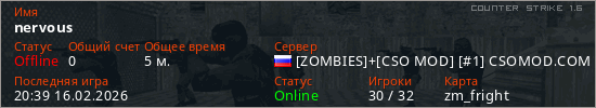 Играет на Counter Strike 1.6 сервере. Страна: РоссияПервый раз замечен 20:37 16.02.2026