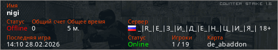 Играет на Counter Strike 1.6 сервере. Страна: РоссияПервый раз замечен 13:59 28.02.2026