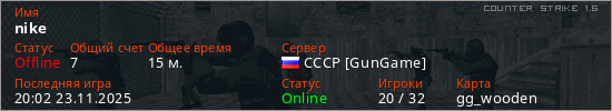 Играет на Counter Strike 1.6 сервере. Страна: РоссияПервый раз замечен 19:38 23.11.2025