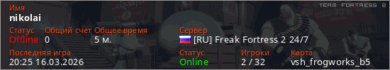 Играет на Team Fortress 2 сервере. Страна: РоссияПервый раз замечен 19:59 16.03.2026